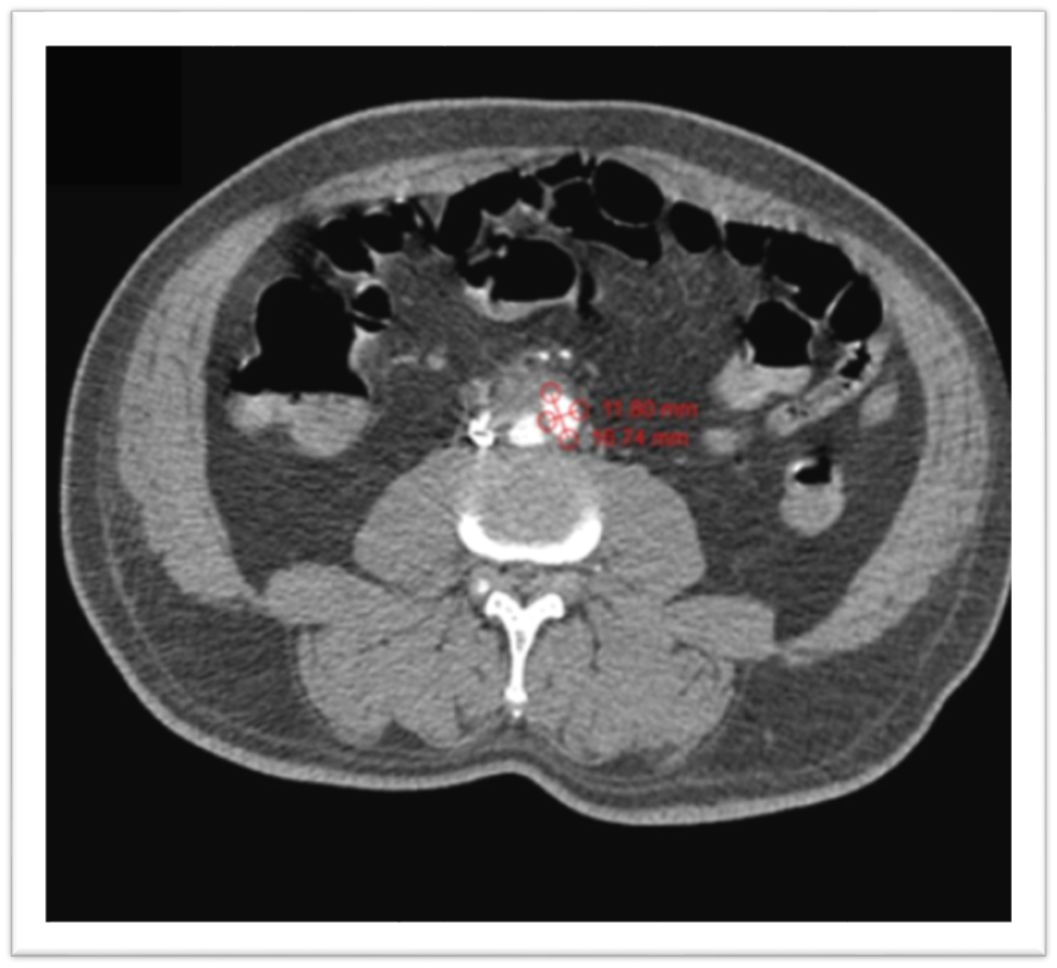The aneurysmal neck measured 17.5 mm, as shown in [Figure 2]. The residual aortic lumen measures 16.7x11.8mm in AP x TR dimensions. The body of the aneurysm is closely abutting the third and fourth parts of the duodenum, associated with increasing hyperdensity in the duodenal lumen on the arterial and venous phases, suggestive of aortoenteric fistulous communication.