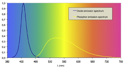 Figure 2: White light spectral representation as a combination of a blue light diode and a yellow phosphor coating. Taken from Behar-Cohen, 2011.