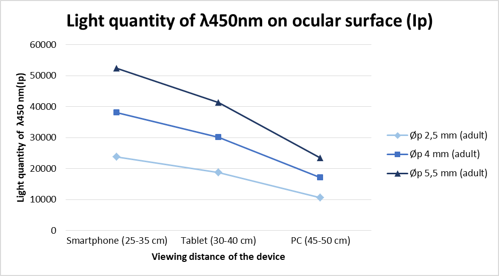 Figure 4 represents how the larger pupillary diameter is, the more light penetrates the eye. Light dose increases when the device approaches the eye. For the laptop working distance (45-50 cm), the amounts of light reaching the pupil were 23431.1; 17040.8 and 10650.5 for pupil diameters of 5.5 mm, 4 mm and 2.5 mm, respectively. For shorter working distances such as when using a smartphone (25-35 cm), the amount of light entering the eye was 52461.3, 38153.7 and 23846.1 when pupillary diameters were 5.5 mm, 4 mm and 2.5 mm, respectively. The amount of light that reaches the eye pupil when an adult uses a smartphone is theoretically 1.4 times greater than that when using a computer.