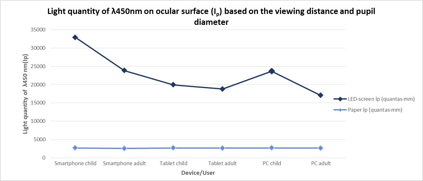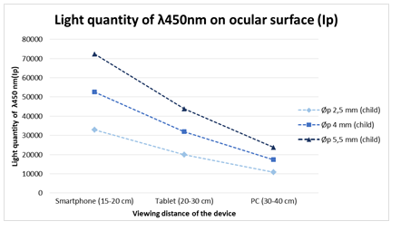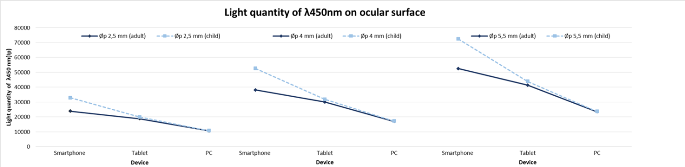 The graph below shows, for each device, that the larger the pupillary diameter and the shorter reading distance, the greater the amount of light enters the eye. This study has not included the pupillary diameter reduction due to screen illumination and the accommodation reflex. Children receive 40% more light than adults when using smartphones due to reduced reading distance.